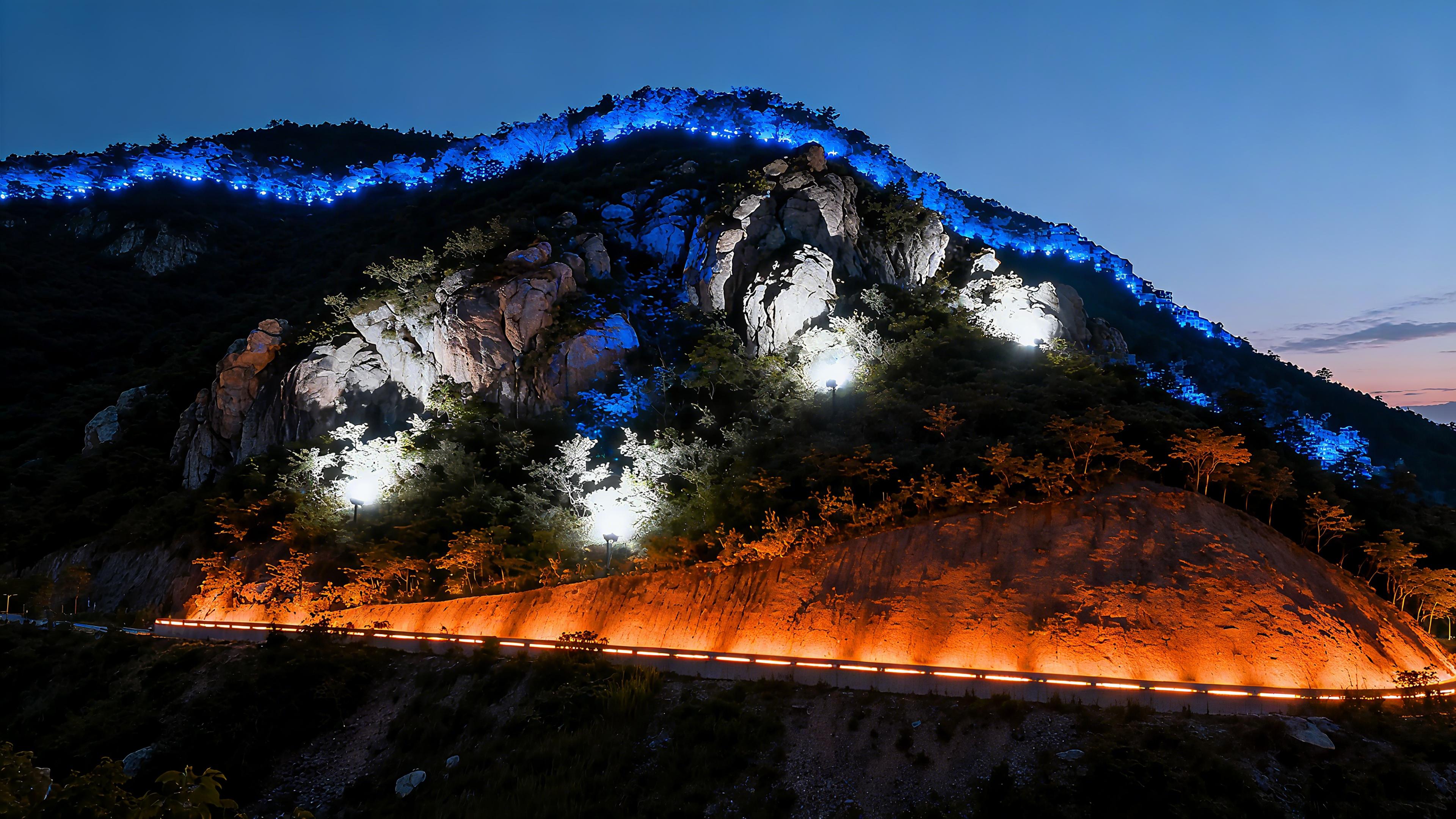 在濟(jì)南老虎洞山隧道周邊山體亮化工程中,公司充分考慮山體與交通設(shè)施的協(xié)同性,設(shè)計(jì)三級(jí)光照模式:隧道出入口山體采用柔和過渡光,避免強(qiáng)光對(duì)行車視線的干擾;登山步道沿線設(shè)置防眩光路燈,構(gòu)建夜間 "安全紐帶";而山頂觀景臺(tái)區(qū)域則通過投光技術(shù)凸顯巖石紋理,形成層次分明的夜間景觀。這種 "功能優(yōu)先、景觀為輔" 的設(shè)計(jì)思路,完美平衡了交通安全與觀賞需求。